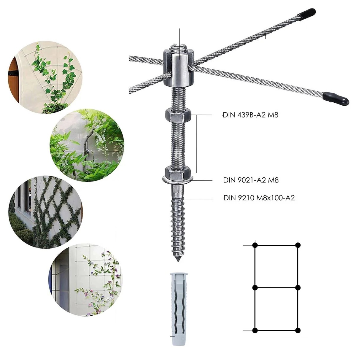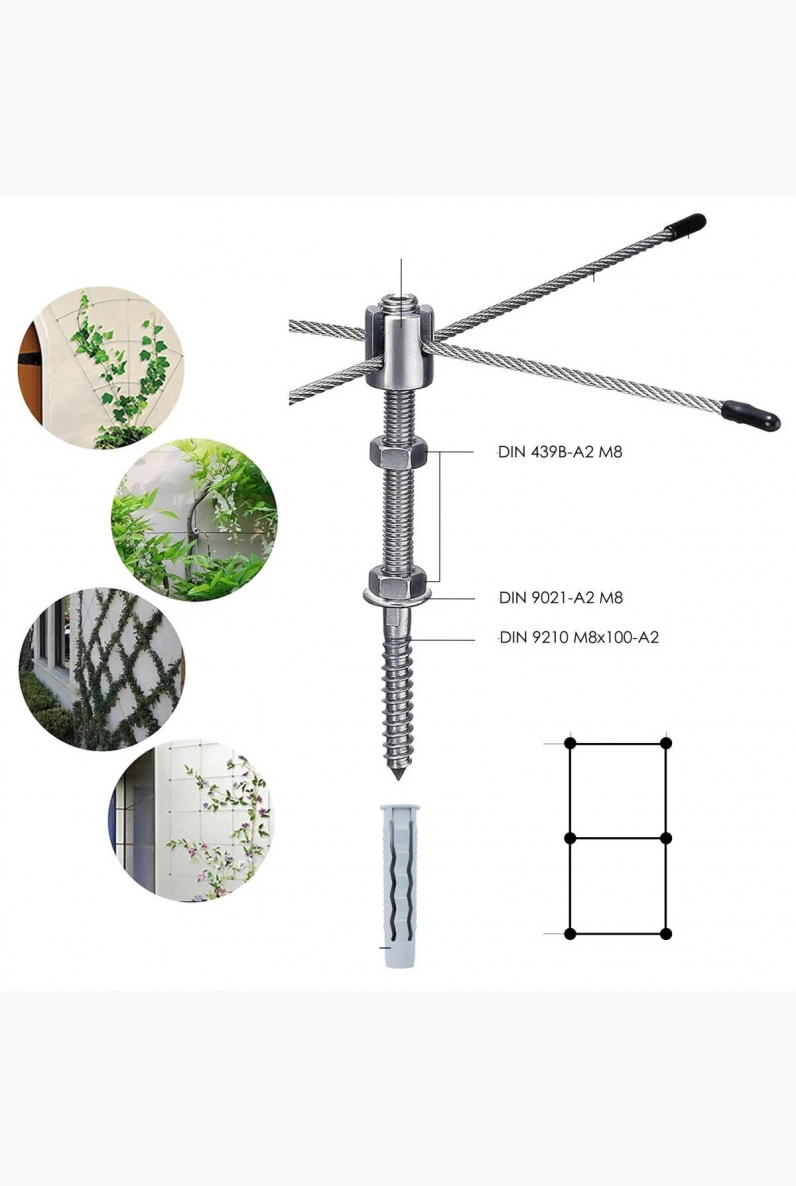 Ši žaliojo fasado sistema skirta fasadų, sienų, balkonų, terasų ar tvorų apželdinimui, naudojant aukštos kokybės nerūdijančio plieno trosą ir tvirtą M8 montavimo elementą. Sistema sukurta taip, kad užtikrintų maksimalų vijoklinių augalų augimą, estetiką ir ilgalaikį atsparumą lauko sąlygoms.
